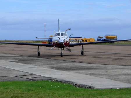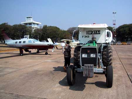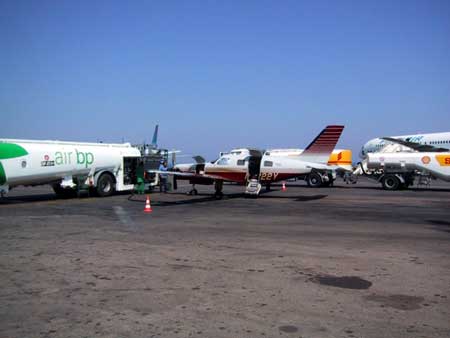 is 665NM routing Overnight was in Reykjavik arriving in heavy rain. From there the next stop is Wick EGPC in northern Scotland. Far North Aviation is doing the service, fuel and charging the landing fees. Attention the IFR approach cost extra ! 10£ if you do not chancel :-) Ready for Africa the next stop still in Europe was Dubrovik in Croatia. and followed by a short fuel stop in Iraklion on Crete. 100 000L fuel in two trucks all for our little Jetprop. We sipped 240L what a business. After Crossing the Med we headed for the Egyptian Desert. Not a lot out there. This changes dramatically when approaching the Nile. The river is giving live since thousands of years. The Temple proof this. Luxor is the tourist destination and we stopped here too. Most of the 5Star hotels are build directly along the river. Here the Sheraton that offers good pilot rates. Being where the tourist are, we too enjoyed some attractions, only we had to rent the ship after-hours, the ordinary customers went to their rooms already. Our captain handled the sail and ship alone, very impressive. He offered us a 5 day sail cruise to Aswan 200km upstream on his boat the Nile Smile. normally Agate Christy followers are using one of the hotel ships. We prefer air travel and from Luxor to Djibouti we had the longest leg of the whole ferry trip. 1100NM; in FL290 with 23Gal/h flow landing with 35Gal reserve, very comfortable. Quick turn around in this French Colony. Nothing special or worth a photo. Jack went to the airport (tower) toilets. He decided never to stop there again. the day was already long and the second leg with 900NM added to it. The destination Mombassa, Kenya. Landing at night and tank-off very early. No time to enjoy the White Sands beach resort. Luckily we had a CD player and even better a DVD for the passengers. Instead of them one of us went to the clubseating and stretched out watching a movie. The other watched the progress on the Garmin 530. The next fuel stop was Lilongwe. Never heard about it before? It is the capital of Malawi ! We only found it with the help of our GPS Navigator. Doing 251kts speed over ground with a 20kts cross wind (see the little white arrow in the lower right corner) What a tower and airport building, all for us alone. A very friendly place only the overflight/landing clearance was a problem, the published Fax and SITA contacts are wrong. But after our office called everybody from the tower controller (who is not responsible but had some more new phone number) to the Minister of transport (who felt responsible but did not know who might issue the clearance) we finally got the needed number by phone from ....? somebody. That's Africa After refueling, the fees paid (around 50$ Nav/landing) and a visite to the toilet (very clean, probably because never used) we headed for Livingston, the town named after the fames explorer. We were happy to see the fuel truck that pulled up just after we shut down our turbine. There was a Jet-fuel and Diesel shortage in Zambia but we had confirmed our fuel before. During flight we were studying the pilot handbook what has to be done if tanking Avgas. We arrived early and we continued our river touring habit. After the Nile now on the Zambezi River. The ship called the African Queen runs for a two hours sunset cruise. included in the fair are drinks and a light snack. 45$ for a great time watching elephants, a rhino and plenty of hippos and as the name of the cruise said, the perfect sun set. The morning sun rise was beautiful too, but the large breakfast buffet presented next to the hotel pool was waiting for us. Why we went to Livingston? It's an adventure tourist place. Safari, Quads Rafting, Ultralights, etc. But what comes next after flying Jetprop? a helicopter ride in the Zambezi canyon. and visiting the Victoria Falls. traveling in style, the helicopter landed next to our aircraft. In the rotor-wing we were passengers now it was our turn flying the Malibu over the waterfall. (It's the dry season and the water level is very low) From Livingston we flew over Botswana south and to our final destination Kruger National airport South Africa. Ones arrived home, we wanted to see how the aircraft will do it's new job. The Jetprop on the job.